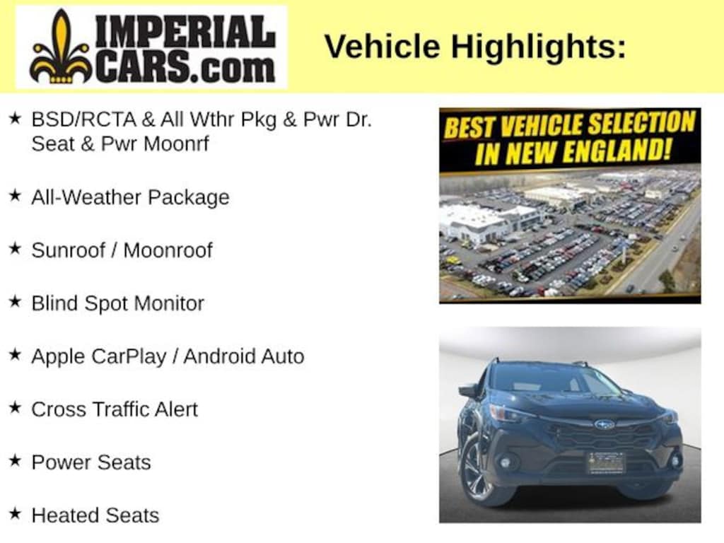 Indulge in a host of premium features, including a - Sunroof / Moonroof, Blind Spot Monitor, Apple CarPlay / Android Auto, Cross Traffic Alert, Power Seats, Heated Seats, Backup Camera, Bluetooth, Cruise Control, Power Windows, Power Locks, Steering Wheels Radio Controls, Aluminum Wheels, and a Luggage Rack. The Crosstrek Premium also boasts the BSD/RCTA & ALL WTHR PKG & PWR DR. SEAT & PWR MOONRF package, which includes automatic emergency steering, Blind Spot Detection (BSD), Rear Cross-Traffic Alert (RCTA) System, a 10-Way Power Driver's Seat, Heated Power Exterior Mirrors, Dual-Mode Heated Front Seats, and a Power Moonroof.