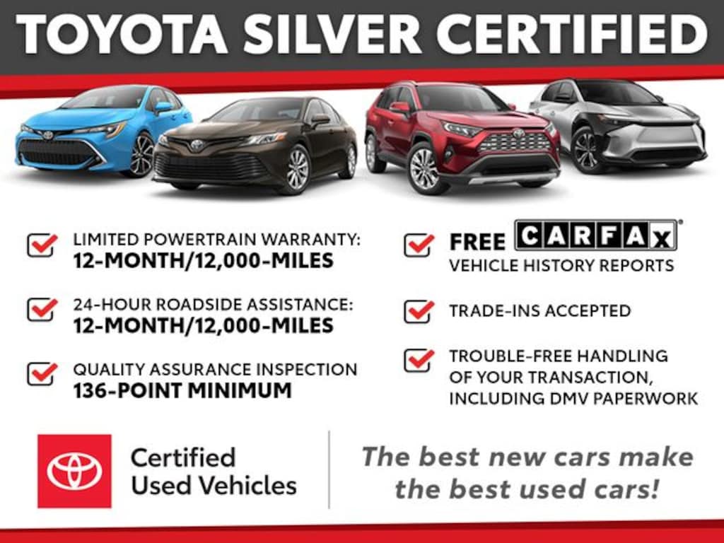 * SILVER CERTIFIED Eligibility: Vehicles up to 10 Model Years Old & Between 60,000-125,000 Miles on Odometer; Outside Gold Eligibility Parameters, Limited Powertrain Warranty: 12-Month/12,000-Mile(2), 24-Hour Roadside Assistance: 12-Month/12,000-Mile(3), Extended Warranty Coverage (items 2 and 3 above) Transferable at No Cost For Added Resale Value, Quality Assurance Inspection: 136-Point Minimum, Free CARFAX Vehicle History Report, Warranty Honored at Over 1,400 Toyota Dealers in the Continental U.S. and Canada, Trade-Ins Accepted, Trouble-free Handling of Your Transaction; Including DMV Paperwork