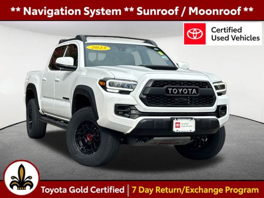 Navigation System, Sunroof / Moonroof, Blind Spot Monitor, Lane Keeping Assistance, Apple CarPlay / Android Auto, Adaptive Cruise Control, Cross Traffic Alert, Power Leather Seats, Heated Seats, Backup Camera, Bluetooth, ** Toyota CPO Certified **, Cruise Control, Power Windows, Power Locks, Steering Wheel Radio Controls, Aluminum Wheels, Towing Package, Running Boards, 4WD, 120V/400W Deck Mounted AC Power, Auto-Dimming Rearview Mirror w/HomeLink, Black Overfenders, Black Wheel Locks, Blind Spot Monitor w/Rear Cross Traffic Alert, Engine Immobilizer, Front Door Smart Key System w/Push Button Start, Heritage Grille, Hood Graphics, Multi Terrain Monitor w/Camera, Navigation System, Power Sliding Rear Window w/Privacy Glass, Rear Parking Assist Sonar, Rigid Industries LED Fog Lights, TRD Pro Cat-Back Exhaust, TRD Pro Exterior Badging, TRD Pro Floor Mats, TRD Pro Headlamps, TRD Pro Package, TRD Pro Shift Knob, TRD-Tuned Off-Road Suspension. Recent Arrival! Certified. Ice Cap 2023 Toyota Tacoma TRD Pro V6 V6 TRD Pro 4D Double Cab 3.5L V6 4WD 6-Speed Automatic