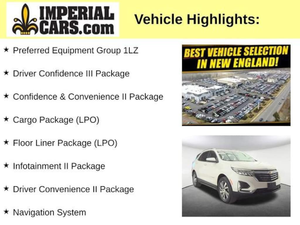 Experience the pinnacle of modern SUV design and performance with the 2023 Chevrolet Equinox Premier. This exceptional vehicle combines a sleek, sophisticated exterior with a meticulously crafted interior, offering a driving experience that will exceed your expectations.- Adaptive Cruise Control- Aluminum Wheels- Backup Camera- Blind Spot Monitor- Bluetooth- Cross Traffic Alert- Cruise Control- Heated Seats- Lane Keeping Assistance- Luggage Rack- Navigation System- Power Leather Seats- Power Locks- Power Windows- Steering Wheels Radio Controls- Sunroof / MoonroofElevate your driving experience with the Equinox Premier's impressive array of advanced features. The Bose Premium 7-Speaker Audio System and Chevrolet Infotainment 3 Plus System with Connected Navigation deliver exceptional sound quality and seamless connectivity. Enjoy the convenience of Adaptive Cruise Control, Blind Spot Monitor, and Cross Traffic Alert, ensuring a safe and confident journey.Slip into the luxurious, perforated leather-appointed seats and experience the ultimate in comfort and style. The heated and ventilated front seats, along with the heated rear outboard seating positions, provide year-round comfort. The power liftgate and available cargo management solutions make loading and unloading a breeze.Beneath the sleek exterior lies a powerful 1.5L DOHC engine, paired with a 6-speed automatic transmission and all-wheel drive, delivering an impressive balance of efficiency and performance. With an EPA-estimated 24 city/30 highway MPG, the Equinox Premier offers the perfect blend of power and fuel economy.Elevate your driving experience with the 2023 Chevrolet Equinox Premier. Discover the perfect combination of style, technology, and capability that will exceed your expectations. Visit our showroom today and let us demonstrate why the Equinox Premier is the ideal SUV for your lifestyle.