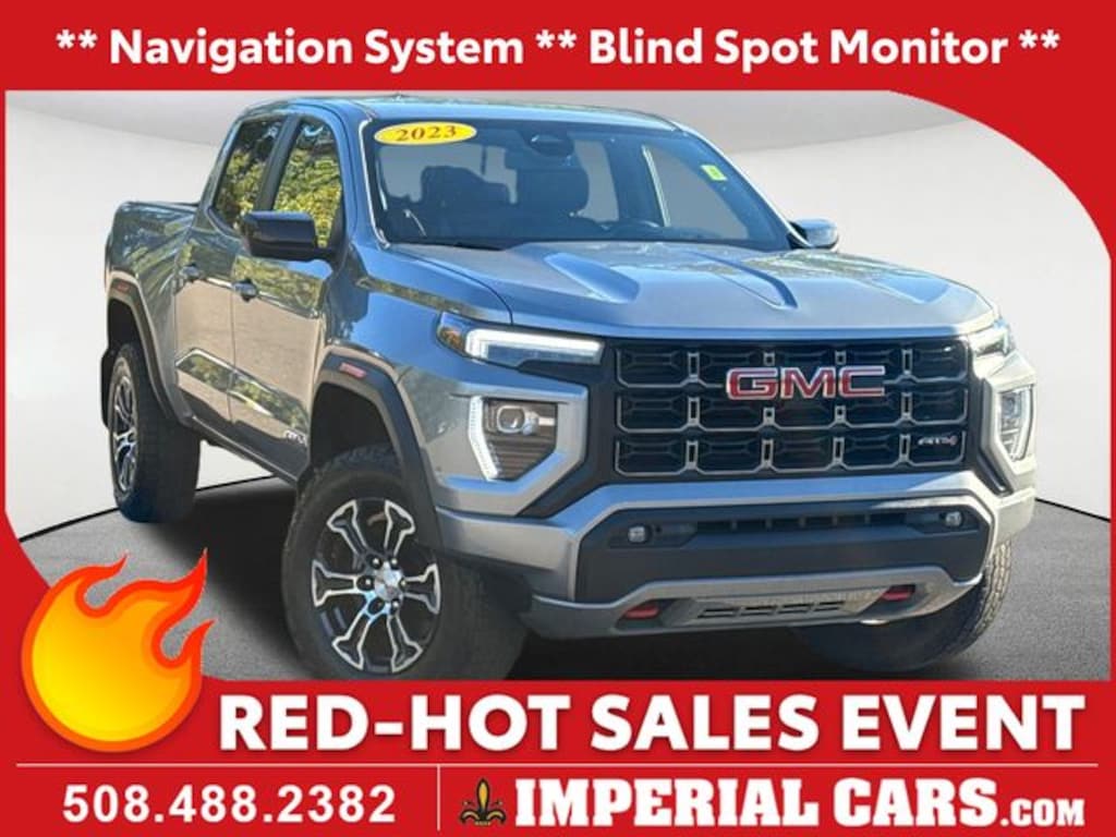 Navigation System, Blind Spot Monitor, Lane Keeping Assistance, Apple CarPlay / Android Auto, Cross Traffic Alert, Power Leather Seats, Heated Seats, Backup Camera, Bluetooth, Cruise Control, Power Windows, Power Locks, Steering Wheel Radio Controls, Aluminum Wheels, Towing Package, 4WD, 120-Volt Bed Mounted Power Outlet, 2 Rear USB Ports in Center Console (Charge-Only), 6-Way Power Passenger Seat Adjuster, 8-Way Power Driver Seat Adjuster, AT4 Premium Package, Automatic Emergency Braking, Automatic Locking Rear Differential, Blind Zone Steering Assist, Canyon Pro Safety, Canyon Safety Plus Package, Driver & Front Passenger Illuminated Visors, Driver & Front Passenger Ventilated Seats, Driver Memory, Driver Seatback Map Pocket, Dual-Zone Automatic Air Conditioning, EZ-Lift & Lower Tailgate, Following Distance Indicator, Forward Collision Alert, Front LED Fog Lamps, Front Pedestrian & Bicyclist Braking, Heated Driver & Front Passenger Seats, Heated Power-Adjustable Outside Mirrors, Heated Steering Wheel, Inside Rear-View Auto-Dimming Mirror, Integrated Trailer Brake Controller, IntelliBeam Automatic High Beam On/Off, Interior Overhead Courtesy Light w/Dual Reading Lamp, Lane Keep Assist w/Lane Departure Warning, Manual Rear-Sliding Window, MultiStow Tailgate, Navigation System, Perforated Leather-Appointed Seat Trim, Power Driver Lumbar Control Seat Adjuster, Power Passenger Lumbar Control Seat Adjuster, Preferred Equipment Group 4SG, ProGrade Trailering System, Rear Center Fold-Down Armrest w/2 Cupholders, Rear Cross Traffic Braking, Rear of Console 120-Volt Power Outlet, Rear-Window Electric Defogger, Remote Vehicle Starter System, Tailgate Keyed Cylinder Lock, Tilt & Telescopic Manual Steering Column, Trailering App System, Trailering Package, Ultrasonic Rear Park Assist, Wireless Charging. Sterling Metallic 2023 GMC Canyon AT4 AT4 4D Crew Cab 2.7L Turbo 4WD 8-Speed Automatic
