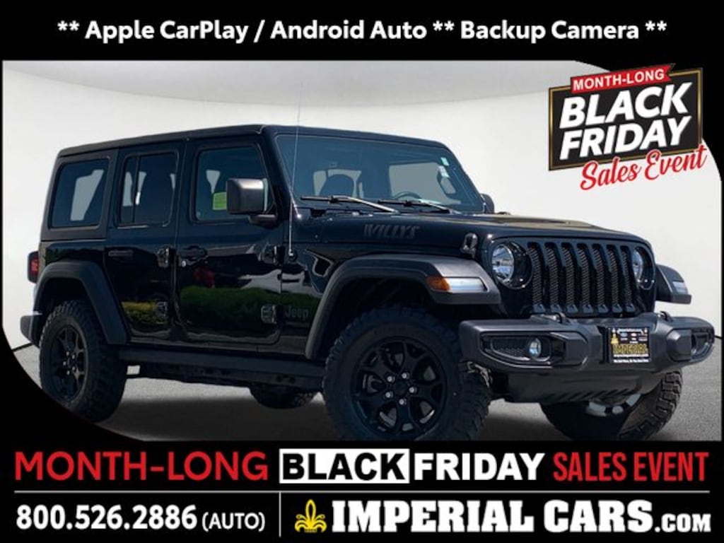 ** HARD TOP ** Apple CarPlay / Android Auto, Backup Camera, Bluetooth, Cruise Control, Power Windows, Power Locks, Steering Wheels Radio Controls, Aluminum Wheels, 4-Wheel Drive Swing Gate Decal, Anti-Spin Differential Rear Axle, Black Grille, Black Trail Rated Badge, Deep Tint Sunscreen Windows, Matte Black Jeep Badge, Mold In Color Bumper w/Gloss Black, MOPAR All-Weather Floor Mats (DISC), Quick Order Package 25K Willys Sport (DISC), Wheels: 17" x 7.5" Moab Black Aluminum, Willys, Willys Hood Decal, Wrangler Decal. Black Clearcoat 2021 Jeep Wrangler Unlimited Willys 4D Sport Utility Unlimited Willys 4WD 8-Speed Automatic