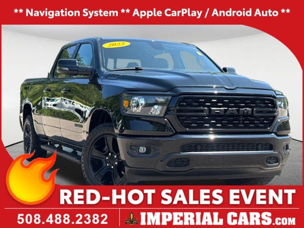 Navigation System, Apple CarPlay / Android Auto, Power Seats, Heated Seats, Backup Camera, Bluetooth, Cruise Control, Power Windows, Power Locks, Steering Wheel Radio Controls, Aluminum Wheels, Towing Package, Running Boards, 115V Auxiliary Power Outlet, 2nd Row In Floor Storage Bins, 3 Rear Seat Head Restraints, 4 Way Front Headrests, 400W Inverter, 4G LTE Wi-Fi Hot Spot, 8.4" Touchscreen Display, 9 Amplified Speakers w/Subwoofer, Accent Color Door Handles, Accent Color Premium Power Mirrors, Air Conditioning ATC w/Dual Zone Control, Anti-Spin Differential Rear Axle, Apple CarPlay, Auto-Dimming Exterior Driver Mirror, Auto-Dimming Rear-View Mirror, Big Horn Badge, Big Horn Level 2 Equipment Group (DISC), Black Exterior Mirrors, Black Exterior Truck Badging, Black Headlamp Bezels, Black Interior Accents, Black Painted Exterior Mirrors Caps, Black Premium Power Mirrors, Bluetooth Handsfree Phone & Audio, Body Color Front Bumper, Body Color Rear Bumper w/Step Pads, Bucket Seats, Center Console Parts Module, Class IV Receiver Hitch, Cluster 7.0" TFT Color Display, Connectivity - US/Canada, Convex Wide-Angle Exterior Mirror Insert, Deluxe Cloth Bucket Seats, Dual Exhaust w/Black Tips, Electric Shift-On-Demand Transfer Case, Exterior Mirrors Courtesy Lamps, Exterior Mirrors w/Heating Element, Exterior Mirrors w/Supplemental Signals, For Details, Visit DriveUconnect.com, For More Info, Call 800-643-2112, Front Fog Lamps, Front Seat Back Map Pockets, Full Length Floor Console, Glove Box Lamp, Google Android Auto, GPS Antenna Input, GPS Navigation, Grille Surround 1 Black Texture 2 Black, Heated Front Seats, Heated Steering Wheel, Integrated Center Stack Radio, LED Footwell Lighting, Manual Adjust 4-Way Front Passenger Seat, Media Hub w/2 Charge Only USBs, Night Edition, ParkSense Front/Rear Park Assist w/Stop, Power 2-Way Driver Lumbar Adjust, Power 8-Way Driver Seat, Power Adjustable Pedals, Power-Folding Mirrors, Quick Order Package 27Z Big Horn, Radio: Uconnect 5 W w/8.4" Display, RAM Grille Badge - Black, Rear 60/40 Folding Seat, Rear Center Armrest, Rear Dome w/On/Off Switch Lamp, Rear Power Sliding Window, Rear Window Defroster, Remote Start System, Security Alarm, SiriusXM Satellite Radio, Sun Visors w/Illuminated Vanity Mirrors, Universal Garage Door Opener, USB Host Flip, Wheels: 20" x 9.0" Premium Paint/Polished. Diamond Black Crystal Pearlcoat 2023 Ram 1500 Big Horn/Lone Star Night Edition Night Edition Big Horn/Lone Star 4D Crew Cab HEMI 5.7L V8 Multi Displacement VVT eTorque 4WD 8-Speed Automatic