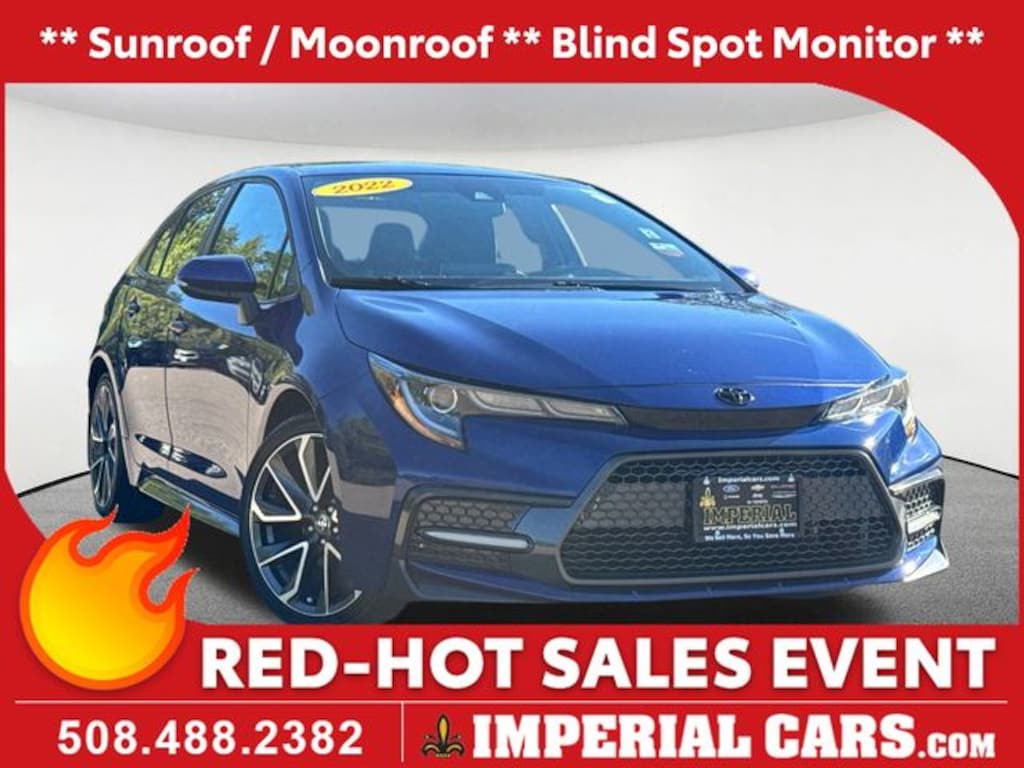 Sunroof / Moonroof, Blind Spot Monitor, Lane Keeping Assistance, Apple CarPlay / Android Auto, Collision Avoidance Assistance, Backup Camera, Bluetooth, Cruise Control, Power Windows, Power Locks, Steering Wheel Radio Controls, Aluminum Wheels, Blind Spot Monitor (BSM) w/RCTA, Front Doors Smart Key System, Power Tilt/Slide Moonroof, SE Premium Package. Blue 2022 Toyota Corolla SE SE 4D Sedan 2.0L I4 DOHC 16V FWD CVT